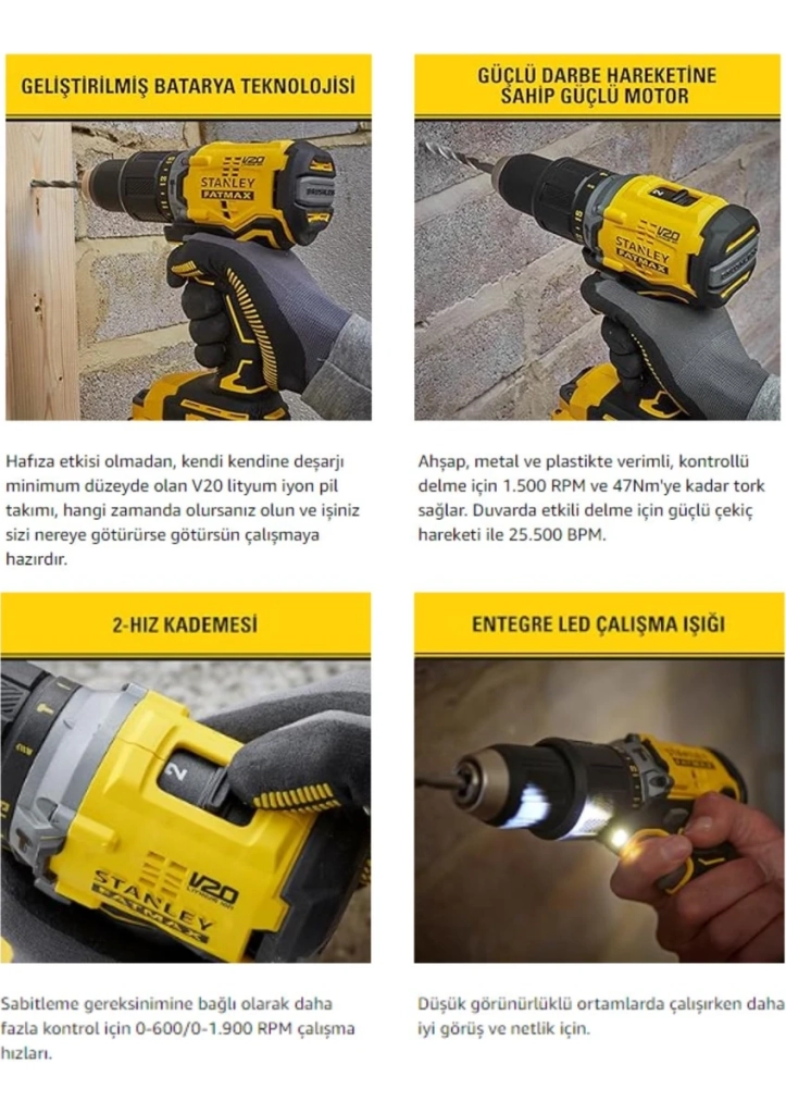 Stanley 18V 2.0AH V20 Li-Ion Çift Akülü Kömürsüz Darbeli Matkap SBD715D2K-TR