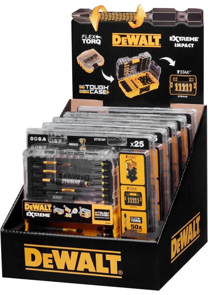 • Özellikler DeWALT tornavida ucu seti DT70730T Flextorq serisindendir Bu uçlar ve tutucular darbeli tornavidanın yüksek torku için idealdir 25mm Pozidriv: 7× Pz2, 1× Pz3 57mm Pozidriv: 2× Pz2, 1× Pz3 Pozidriv 85mm: 1× Pz2 Philips 57mm: 2× Ph2 Philips 85mm: 1× Ph2 Torx 50 mm: 2× T20, 2× T25, 2× T30 Oluklu 25mm: 1× SL6, 1× SL8 Temizlenebilir altıgen lokma: 8, 10 mm Manyetik Bits tutucu ×1